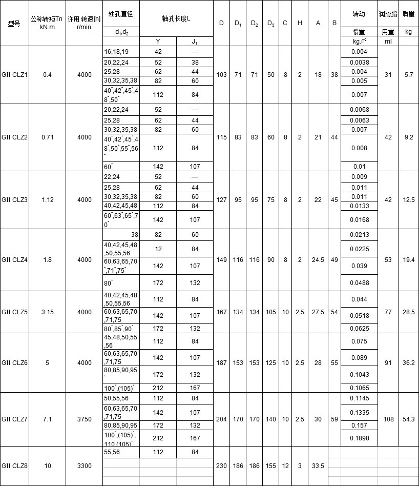 GⅡCLZ型鼓形齒式聯軸器的參數和主要尺寸:(JB/T 8854.2-2001) mm