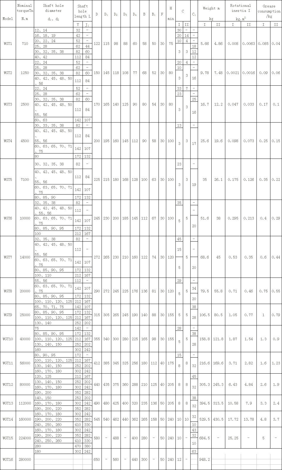 WGT型--接中間套型,適用于兩軸長距離聯(lián)接,許用轉(zhuǎn)速[n]取決于中間套的長度和質(zhì)量,并應(yīng)驗(yàn)算臨界轉(zhuǎn)速;