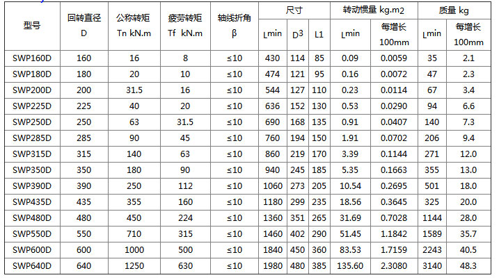 SWP-D型萬(wàn)向聯(lián)軸器 特點(diǎn)及應(yīng)用場(chǎng)合:軸承是易損件.為便于更換軸承,將軸承座壓蓋作成剖分式,螺栓聯(lián)接,可在β≤5°~10°工況下工作。適用于軋鋼機(jī)械、起重運(yùn)輸機(jī)械、工程機(jī)械、礦山機(jī)械、石油機(jī)械及其他重型機(jī)械,聯(lián)接兩個(gè)不同軸線(xiàn)的軸系傳動(dòng),不能緩沖、減振。
